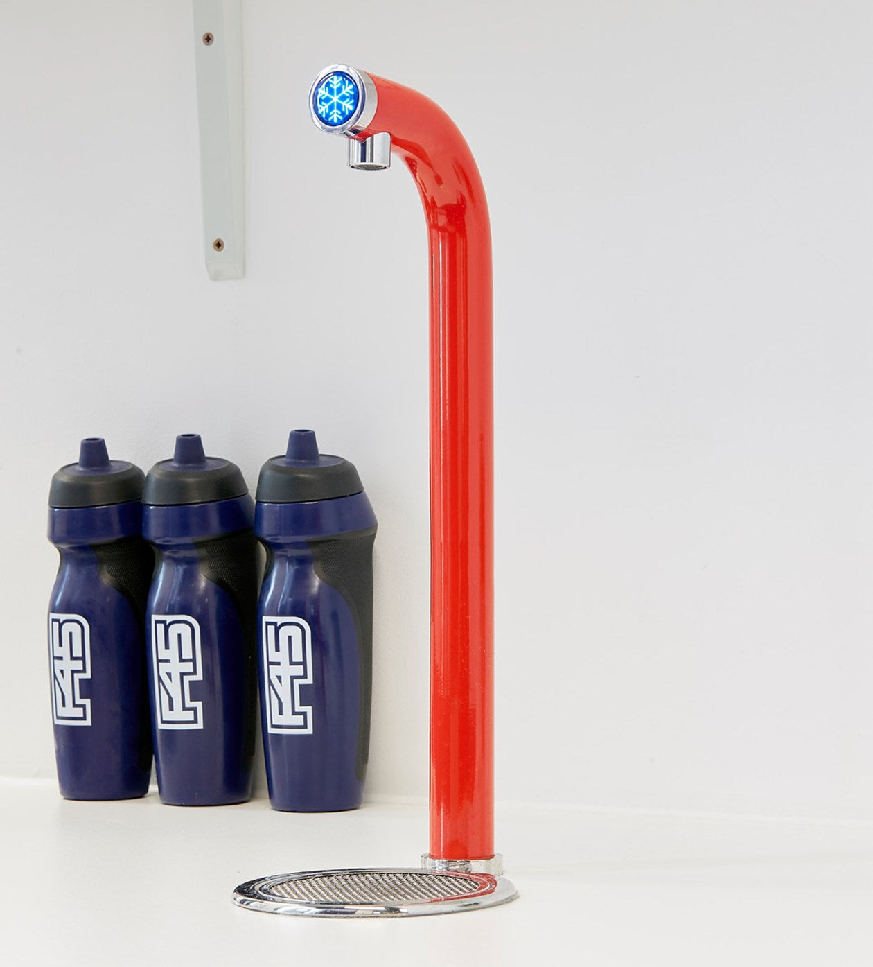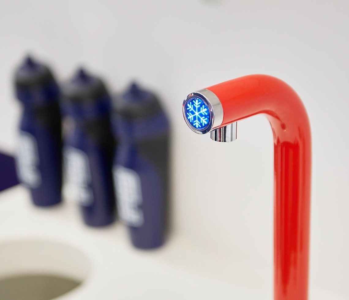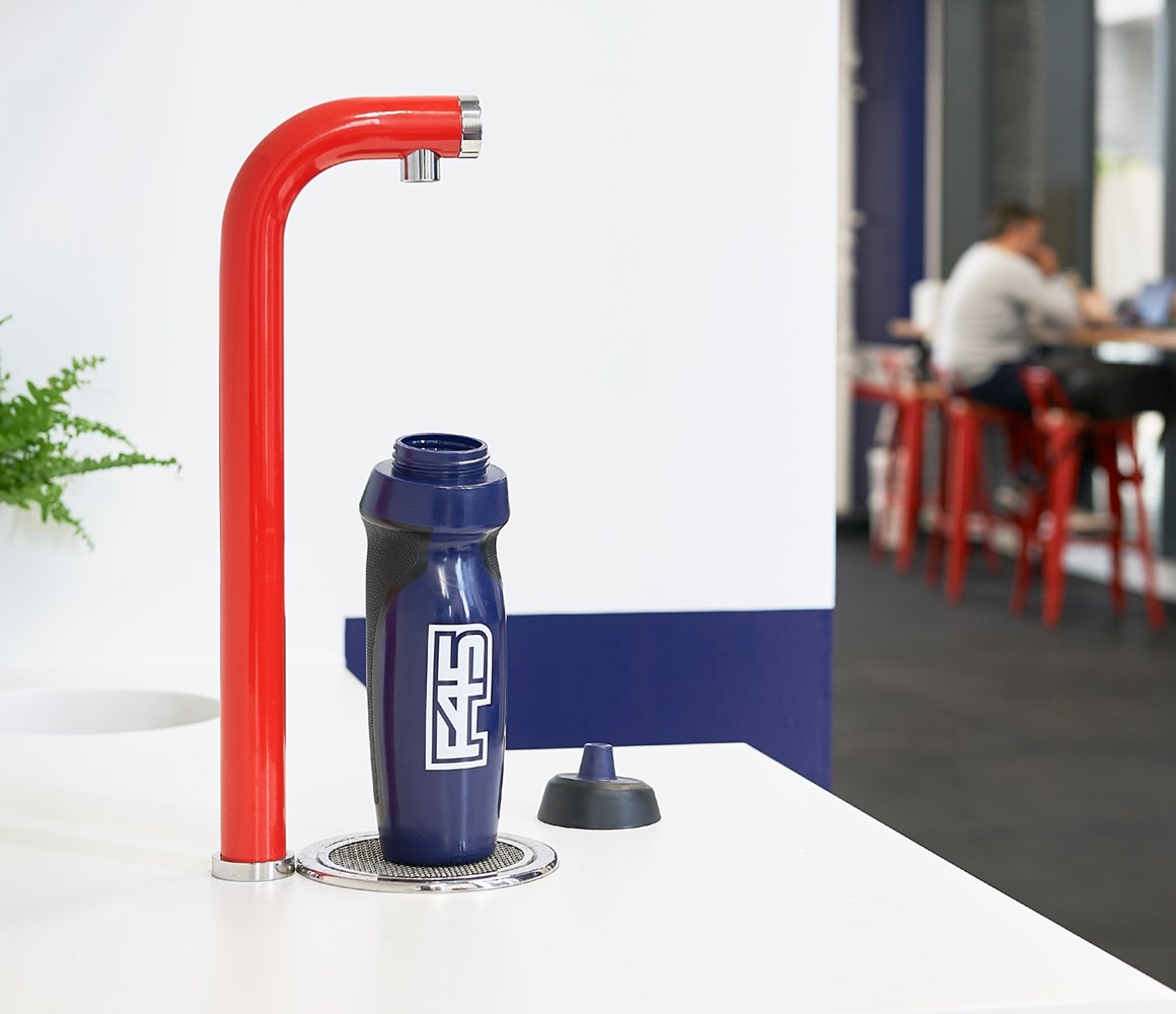 An Aqua Alto Tap that dispenses many litres of chilled, still water every hour. Because Aqua Alto is available in any colour, the studio team chose a red finish to match F45’s corporate branding.