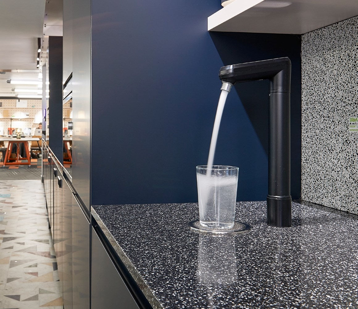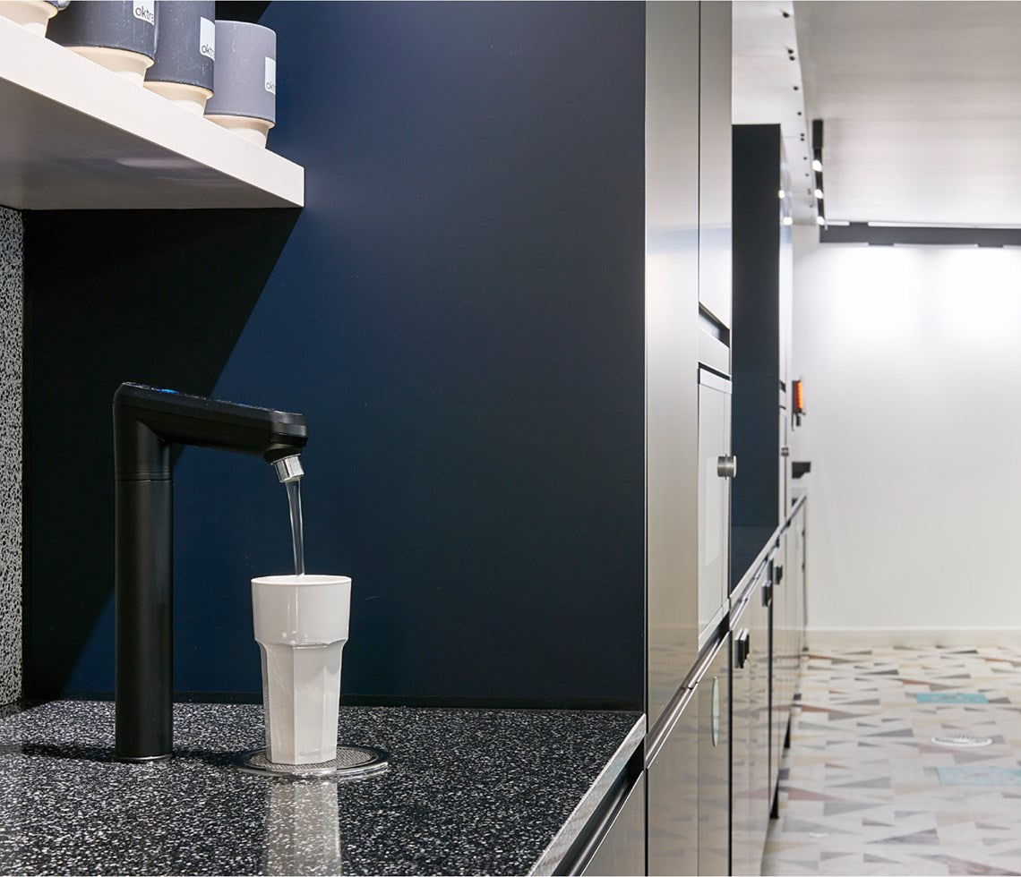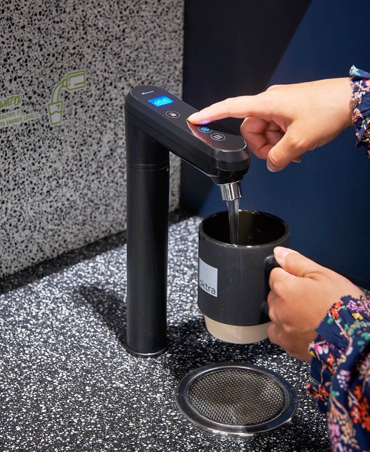 The Aqua Libra Co team installed two Aqua illi Taps in stylish Satin Black finish, each dispensing boiling, chilled, and sparkling water. At one of the hydration stations, the tap features a 60mm extension to enable bottle filling.