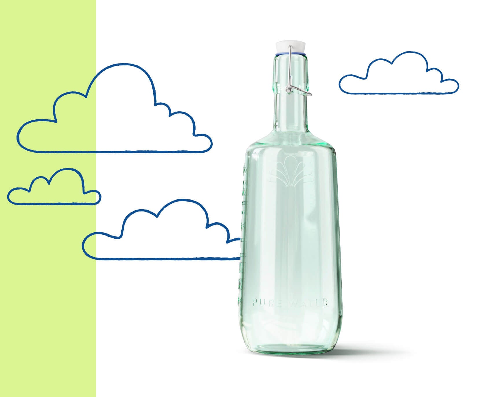 Our glass bottles, suitable for both still and sparkling water, are equipped with swing-top stoppers and crafted from 70% post-consumer recycled glass.